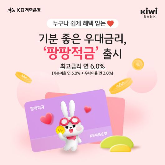 한편, 팡팡적금은 KB저축은행 kiwibank 앱과 웹에서만 신청 가능하며, 상품 관련 문의사항은