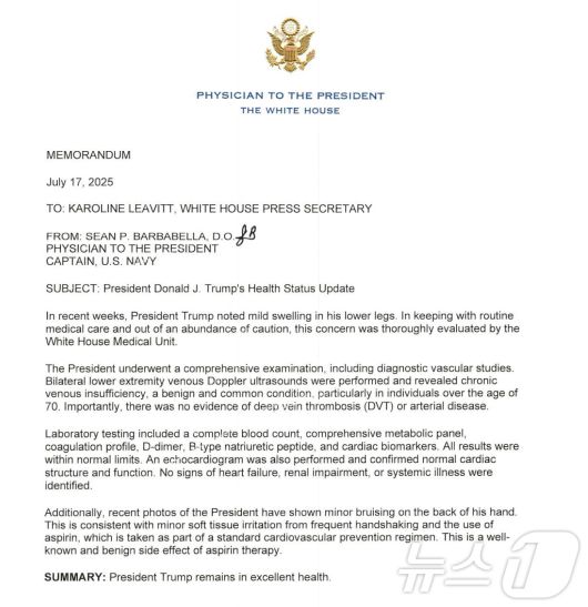 이날 백악관이 공개한 숀 바르바벨라 대통령 주치의의 서한에 따르면 이번 검사에서 심부정맥 혈전증이나 동맥 질환의 징후는 발견되지 않았다. 심장 초음파 검사에서도 심장 구조와 기능이 정상으로 확인됐으며 심부전이나 신장 손상 등의 징후도 없었던 것으로 나타났다.