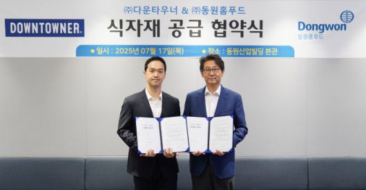 동원홈푸드는 지난 17일 서울시 서초구에 위치한 동원그룹 본사에서 다운타우너와 식자재 공급 협약을 체결했다. 이날 행사에는 정문목 동원홈푸드 대표와 이건호 다운타우너 대표 등 양사 임직원들이 참석했다.