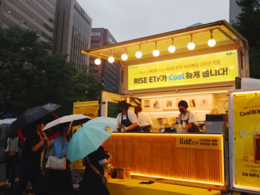 KB자산운용이 17일 서울 여의도 IFC 잔디광장과 교직원공제회 본사 앞에서 'RISE ETF' 브랜드 개편 1주년을 맞아 커피차 이벤트를 진행했다.