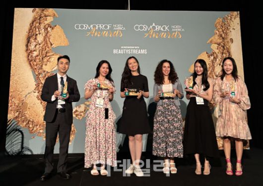 2025 북미 코스모프로프 어워드 위너 수상식에 참가한 수상자들이 기념사진을 찍고 있다. 왼쪽에서 두 번째가 윤지혜 아이큐어 팀장 (사진=아이큐어) |