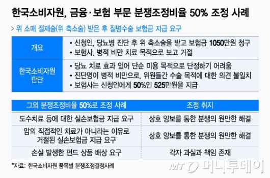 지난 2월 공개된 소비자원의 위소매절제술(위축소술) 관련 질병수술보험금 지급 요구 건의 경우 신청인(소비자)과 피신청인(보험사)의 조정 비율이 각각 50%로 결정됐다. 당뇨 치료 목적이냐, 비만 치료(미용 치료) 목적이냐에 따라 보험금이 크게 갈리는 분쟁건이다. 소비자원은 "비만 치료 목적이라고 단정하기 어렵고 일부 전문위원 의견이 엇갈린다"며 '50% 배상' 판단을 내렸다.