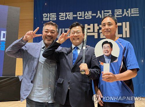 (대전=연합뉴스) 김정진 기자 = 더불어민주당 박찬대 당 대표 후보(가운데)가 지난 16일 대전대 혜화문화관에서 열린 토크 콘서트 직후 배우 이원종 씨(왼쪽)와 당원 송진우씨와 기념 촬영하고 있다. 2025.7.18