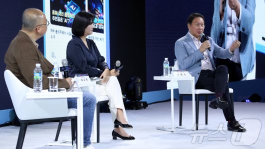 최태원 대한상의 회장 겸 SK그룹 회장이 19일 제주 신라호텔에서 열린 대한상의 제주포럼에서 진행된 최수연 네이버 대표와의 'AI 토크쇼'에서 대담을 하고 있다.(대한상의 제공) 2024.7.19/뉴스1 ⓒ News1 김재현 기자 |