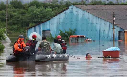 17일 충남 예산군 고덕면 용리에서 중앙119구조본부 충청강원 119특수구조대 대원들이 보트로 주민을 구조하고 있다. 예산=뉴스1 |