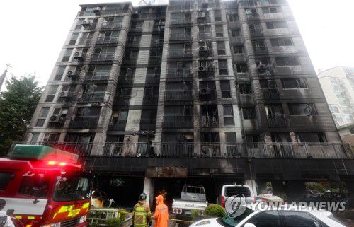 (광명=연합뉴스) 홍기원 기자 = 전날 주차장에서 발생한 화재로 다수의 인명피해가 발생한 경기도 광명시 소하동 한 아파트에서 18일 경찰과 소방 등 관계자들이 현장을 살펴보고 있다. 2025.7.18