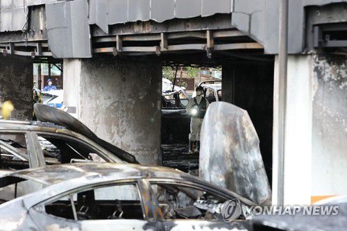 (광명=연합뉴스) 홍기원 기자 = 전날 주차장에서 발생한 화재로 다수의 인명피해가 발생한 경기도 광명시 소하동 한 아파트에서 18일 경찰과 소방 등 관계자들이 현장을 살펴보고 있다. 2025.7.18