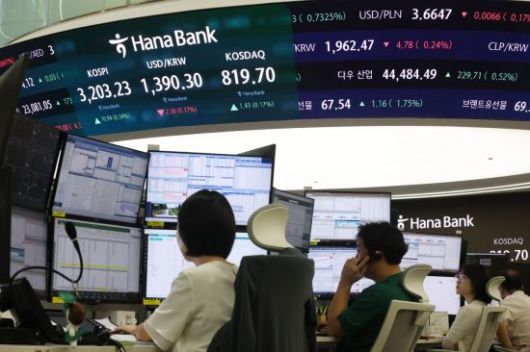 미 나스닥이 사상최고치로 마감한 가운데 코스피지수도 3200선을 회복하며 출발한 18일 서울 중구 하나은행 딜링룸 모니터에 코스피를 비롯해 원/환율 등이 표시돼 있다. 이날 코스피는 전장보다 8.15포인트(0.26%) 오른 3200.44 시작해 강보합을 이어가고 있다.