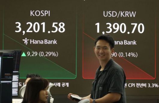 미 나스닥이 사상최고치로 마감한 가운데 코스피지수도 3200선을 회복하며 출발한 18일 서울 중구 하나은행 딜링룸 모니터에 코스피를 비롯해 원/환율 등이 표시돼 있다. 이날 코스피는 전장보다 8.15포인트(0.26%) 오른 3200.44 시작해 강보합을 이어가고 있다.