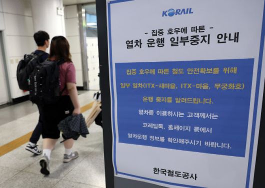 [이데일리 이다원 기자] 전국에 400㎜ 넘게 쏟아진 집중호우 영향으로 일반 열차와 KTX 운행이 일부 중단됐다.