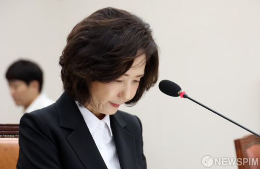 [서울=뉴스핌] 정일구 기자 = 이진숙 부총리 겸 교육부 장관 후보자가 16일 오전 서울 여의도 국회 교육위원회에서 열린 인사청문회에서 자녀 조기 유학 관련 의원 질의에 답한 뒤 고개를 숙이고 있다. 2025.07.16 mironj19@newspim.com |