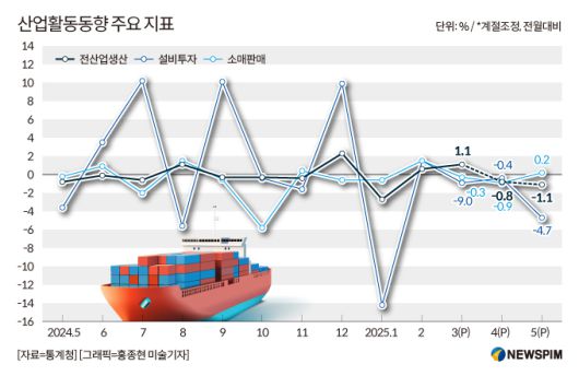 경기 상황을 나타내는 주요 실물 지표들은 여전히 내리막길을 걷고 있다. 5월 기준 전산업 생산은 전월 대비 1.1% 감소했다. 광공업(-2.9%)과 서비스업(-0.1%), 건설업(-3.9%) 등에서 모두 줄어든 결과다. 특히 건설업은 전년 동월과 비교하면 20.8% 급감했다.