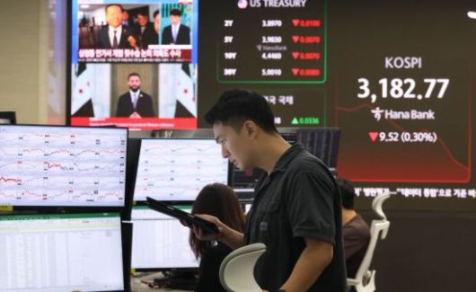 18일 서울 중구 하나은행 딜링룸 모니터에 코스피를 비롯해 원/환율 등이 표시돼 있다. 이날 코스피는 전장보다 8.15포인트(0.26%) 오른 3200.44 출발했지만 10시 현재 하락세를 이어가고 있다. <ⓒ투자가를 위한 경제콘텐츠 플랫폼, 아시아경제(www.asiae.co.kr) 무단전재 배포금지>