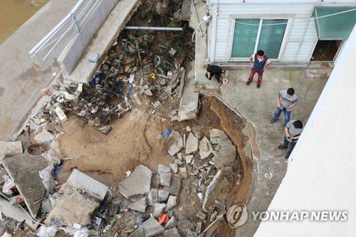 (광주=연합뉴스) 김혜인 기자 = 18일 오전 광주 북구 신안동 한 공장의 바닥이 전날 쏟아진 역대급 폭우의 영향으로 무너져있다. 전날 광주에는 하루 426.4㎜의 비가 내려 기상 관측 이래 가장 많은 강수량을 보였다. 2025.7.18