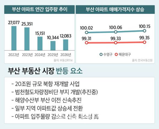 신축 아파트의 희소성은 더 부각된다. 부동산R114에 따르면 부산 아파트 입주 물량은 2022년 2만7000여 가구에서 올해 1만여 가구 수준으로 급감했으며, 2028년까지도 이 같은 감소 흐름이 이어질 전망이다.