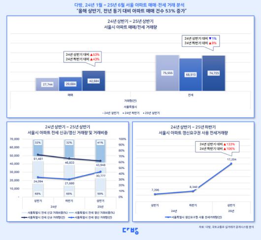 다방 관계자는 “급변하는 부동산 시장 현황을 살펴보기 위해 서울 아파트 매매와 전세 거래를 비교 분석했다”라며 “올해 상반기는 토허제 해제와 지정, 하반기는 고강도 대출 규제 등 시장의 불확실성이 계속되고 있어 그 어느 때보다 실수요자들의 신중한 판단이 필요한 상황”이라고 말했다.