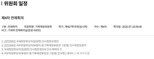 그러나 야당 간사인 박수영 국민의힘 의원은 “명확하게 기재부 장관, 국세청장 후보자를 함께 하자고 얘기했던 것 같진 않다”면서 “빠른 시일 내에 국세청장 후보자도 날짜를 잡아서 함께 논의해 통과시킬 수 있게 노력하겠다”고 했다.