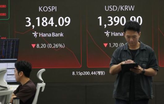 18일 서울 중구 하나은행 딜링룸 모니터에 코스피를 비롯해 원/환율 등이 표시돼 있다. 이날 코스피는 전장보다 8.15포인트(0.26%) 오른 3200.44 출발했지만 10시 현재 하락세를 이어가고 있다. 2025.7.18 조용준 기자 |