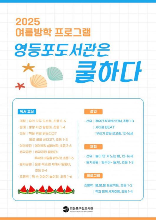 최호권 영등포구청장은 “책과 체험이 있는 도서관에서 학생들이 뜻깊은 여름방학을 보내길 바란다”며 “앞으로도 아이들이 즐겁게 배우고 성장할 수 있는 교육·문화 프로그램을 지속적으로 확대해 나가겠다”고 말했다.
