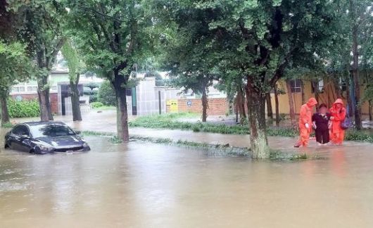 호우 특보가 발효된 지난 17일 오후 전남 담양군 고서중학교 인근 도로가 물에 잠겨 소방 당국이 안전조치를 하고 있다. 연합뉴스 |