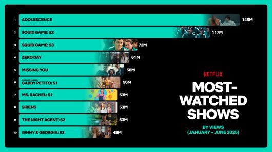 한편 비영어권 콘텐츠의 강세는 넷플릭스의 현지화 전략이 올바른 방향임을 다시 한번 입증했다. 전체 시청 시간의 3분의 1 이상이 비영어권 작품에서 나왔고 상반기 최다 시청 시리즈 25편 중 10편이 비영어권 작품이었다. 영국의 <소년의 시간>(1억4500만) 덴마크의 <우리가 숨겨온 비밀>(3400만) 등 유럽 시리즈의 성공은 '좋은 이야기는 어디에서나 나온다'는 넷플릭스의 철학이 구호가 아님을 보여준다.