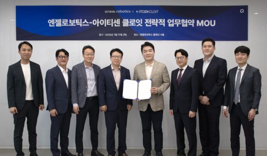 이세희 아이티센클로잇 대표(왼쪽에서 네 번째)와 조남민 엔젤로보틱스 대표(오른쪽에서 네 번째) 등 양사 관계자들이 MOU 체결 후 기념촬영을 하고 있다. 아이티센그룹 제공 |