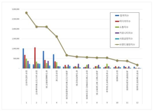 3위, 축산물품질평가원 브랜드는 참여지수 882,970 미디어지수 425,966 소통지수 276,132 커뮤니티지수 380,364 사회공헌지수 150,500이 되면서 브랜드평판지수 2,115,932로 분석됐다. 지난 6월 브랜드평판지수 1,999,807과 비교해보면 5.81% 상승했다.