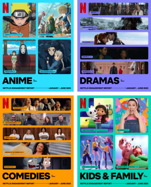 키즈·패밀리 부문은은 '케이팝 데몬 헌터스' 외 '개비의 매직 하우스'가 시즌 통합 1억800만 시청 수를 기록했다. '미스 레이첼' 시즌1과 '아스테릭스와 오벨릭스: 마을의 대결투'도 각각 5300만, 1600만으로 인기를 끌었다.