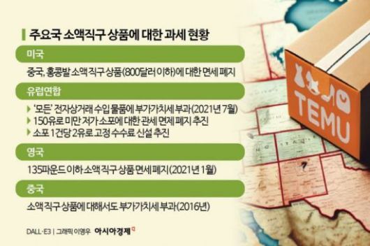 미국은 지난 4월 도널드 트럼프 대통령이 800달러(약117만원) 미만 중국산 수입품에 대해 관세를 제외해주는 '소액 면세 기준'을 폐지하는 행정명령에 서명했다. 중국도 2016년부터 소액의 직구 상품에 대해서도 부가세를 걷고 있다. 호주는 2018년부터 연 판매액 7000만원 이상의 해외 플랫폼에 대해 사업자 등록을 하고 부가세를 분기별로 납부하게 하고 있다.
