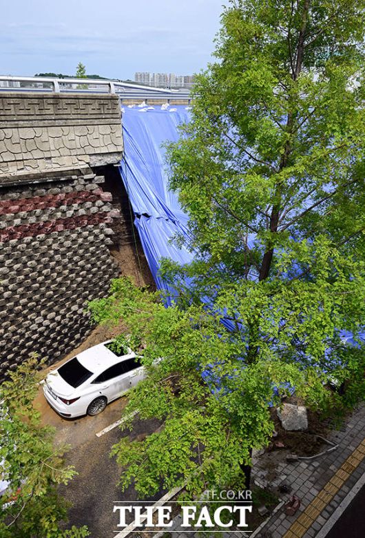 [더팩트ㅣ오산=임영무 기자] 16일 저녁 시간당 41mm의 강한 비로 옹벽을 지지하던 토사가 침하돼 차량을 덮치는 사고가 발생한 가운데 18일 오전 경기 오산시 가장동 가장교차로 인근 사고 현장에는 흘러내린 벽돌과 토사가 차량 앞 부분을 뒤덮고 있다.