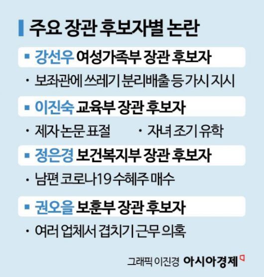 현역 의원인 강 후보자는 보좌진에게 자택 쓰레기 처리, 변기 수리 등의 개인 업무를 지시한 의혹으로 '갑질 논란'에 휩싸였다. 특히 청문회 당시 "단순 오해"라는 해명 후 추가로 공개된 보좌진과의 텔레그램 대화가 나오면서 "거짓 해명"이라는 비판을 불러왔다. 이 후보자 역시 논문 표절과 제자 논문 '가로채기' 의혹, 그리고 차녀의 불법적 조기 유학 문제로 도덕성에 심각한 타격을 입었다.