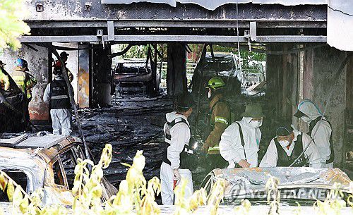 (광명=연합뉴스) 홍기원 기자 = 전날 주차장에서 발생한 화재로 다수의 인명피해가 발생한 경기도 광명시 소하동 한 아파트에서 18일 경찰과 소방, 국과수 등 관계자들이 합동 감식을 하고 있다. 2025.7.18