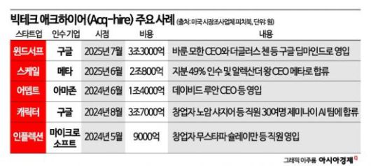 일례로 구글은 최근 AI 코딩 스타트업 '윈드서프'의 최고경영자(CEO) 바룬 모한과 공동 창업자 더글러스 첸 등 주요 연구자를 영입했다. 회사 지분을 인수하거나 경영을 통제하지 않고 소규모 직원 그룹을 구글 딥마인드 일원으로 채용하되 윈드서프 기술 일부를 라이선스 형태로 확보했다. 최근 AI 인재를 빨아들이고 있는 메타는 AI 스타트업 '스케일AI'의 지분 49%를 인수하고 창업자인 알렉산더 왕을 합류시켰다. 아마존에서도 지난해 영입한 AI 스타트업 '어뎁트'의 창업자 데이비드 루안이 현재 아마존 내 범용인공지능(AGI) 연구소를 이끌고 있다.