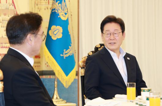 이재명(오른쪽) 대통령이 17일 서울 한남동 관저에서 우원식(왼쪽) 국회의장, 김민석 국무총리와 만찬 자리를 갖고 있다. 2025.7.17 [대통령실통신사진기자단] [연합] |
