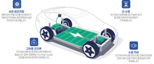 [이데일리 이윤화 기자] 전기차 시장이 최근 가파르게 성장하면서 필수 부품인 타이어에 대한 기술적 수준도 한층 높아지는 추세다. 전기차는 내연기관차 대비 가속성이 빠르지만, 차체가 무겁기 때문에 내구성이 좋아야하며 배터리 효율성을 극대화할 수 있는 기술력을 필요로 한다.