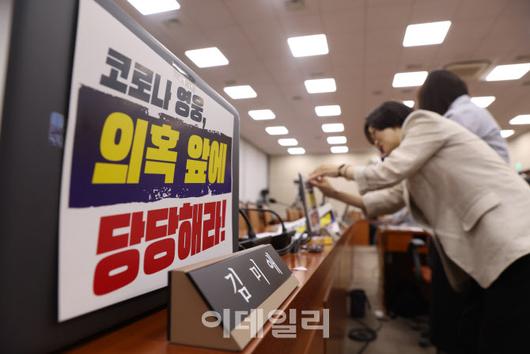 [이데일리 노진환 기자] 18일 오전 서울 여의도 국회 보건복지위원회 전체회의에서 정은경 보건복지부 장관 후보자의 인사청문회가 실시됐다. 국민의힘 관계자들이 의원 노트북에 '코로나 영웅, 의혹 앞에 당당해라!'가 적힌 피켓을 붙이고 있다.