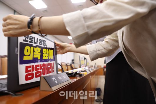 [이데일리 노진환 기자] 18일 오전 서울 여의도 국회 보건복지위원회 전체회의에서 정은경 보건복지부 장관 후보자의 인사청문회가 실시됐다. 국민의힘 관계자들이 의원 노트북에 '코로나 영웅, 의혹 앞에 당당해라!'가 적힌 피켓을 붙이고 있다.