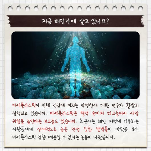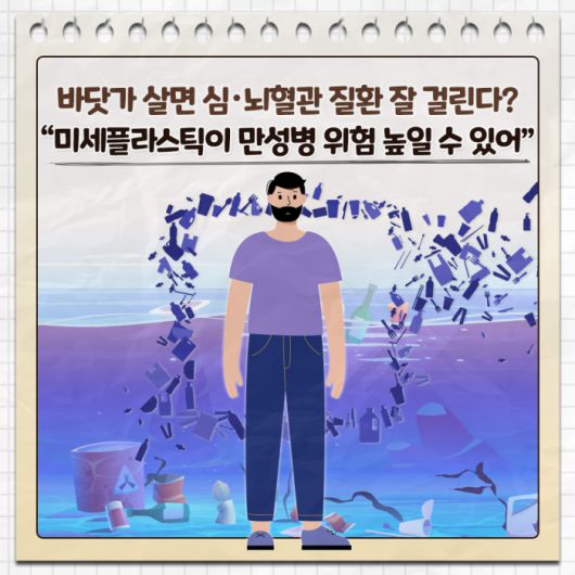 미세플라스틱이 인체 건강에 미치는 악영향에 대한 연구가 활발히 진행되고 있습니다. 미세플라스틱은 혈액 속까지 파고들어서 사망 위험을 높인다는 보고들도 있습니다. 최근에는 해안 지역에 거주하는 사람들에게 상대적으로 높은 만성 질환 발병률이 바닷물 속의 미세플라스틱 영향 때문일 수 있다는 논문이 나왔습니다.