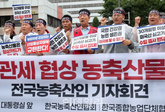 [이데일리 김태형 기자] 전국한우협회는 한국농축산연합회, 한국종합농업단체협의회, 축산관련단체협의회, 농민의길과 공동으로 18일 서울 용산구 대통령실 앞에서 '한-미 상호관세 협상 농축산물 개방 반대를 위한 전국농축산인 기자회견'을 하고 있다.