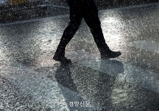 서울을 비롯한 수도권과 충청지역에 호우특보가 발효된 16일 서울 광화문 사거리 일대에서 한 시민이 거세게 내리는 빗속에서 퇴근을 서두르고 있다. 기상청은 많게는 200mm의 폭우가 내릴 것으로 예보했다. 정효진 기자 |
