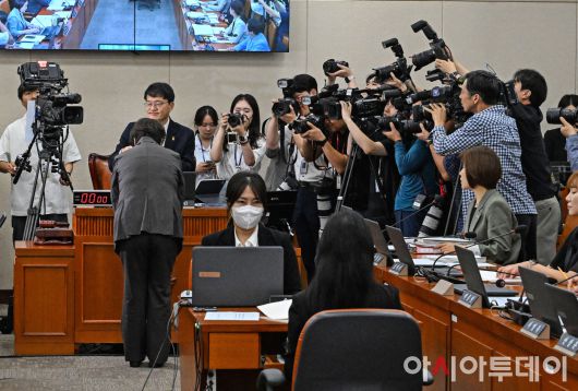 아시아투데이 송의주 기자 = 정은경 보건복지부 장관 후보자가 18일 국회에서 열린 인사청문회에서 박주민 위원장에게 선서문을 제출하고 있다. ⓒ "젊은 파워, 모바일 넘버원 아시아투데이"