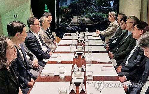 (서울=연합뉴스) 대한의사협회는 대한의학회와 18일 간담회를 열고 전공의 수련 여건 개선을 비롯한 의료현안에 대해 의견을 나눴다고 밝혔다. 김택우 대한의사협회 회장 및 이진우 대한의학회 회장 등 참석자들이 간담회를 하고 있다. 2025.7.18 [대한의사협회 제공. 재판매 및 DB 금지]