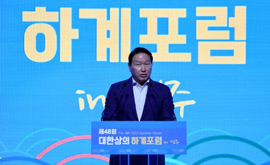 최태원 대한상공회의소 회장이 16일 경북 경주시 라한셀렉트 호텔에서 열린 제48회 대한상공회의소 하계포럼 in 경주에서 개회사를 하고 있다. 뉴시스 |