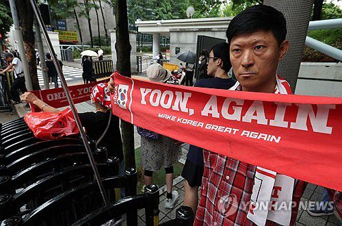 (서울=연합뉴스) 김성민 기자 = 윤석열 전 대통령의 구속적부심 심문이 열린 18일 서울 서초구 서울중앙지방법원 앞에서 윤 전 대통령 지지자들이 '윤 어게인'이라고 적힌 손팻말을 들고 있다. 2025.7.18