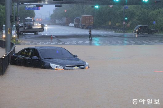 17일 오후 광주 광산구 진곡산단 일대 도로가 폭우로 인해 침수돼 있다. 광주=박영철 기자 skyblue@donga.com |