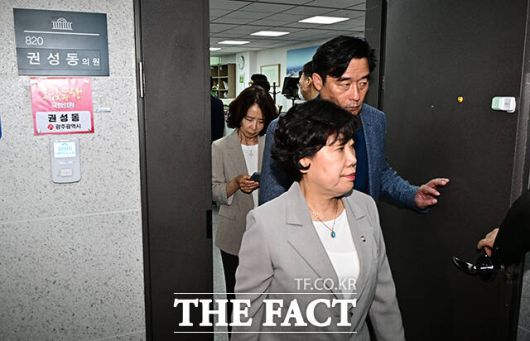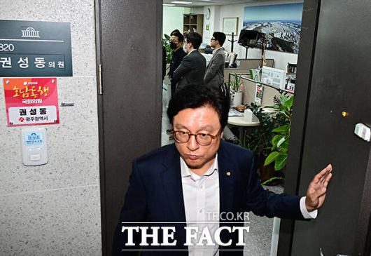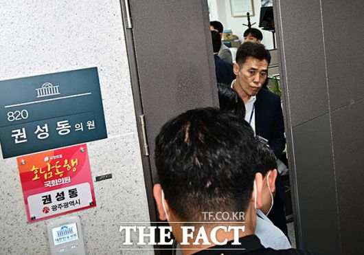 [더팩트ㅣ국회=배정한 기자] 국민의힘 의원들이 18일 오후 서울 여의도 국회 의원회관 내 김건희 특검팀이 압수수색 중인 권성동 의원실에서 나와 이동하고 있다.