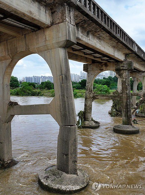 (광주=연합뉴스) 조남수 기자 = 18일 광주 북구 동림동 옛 산동교가 전날 극한 호우에 교각이 파손돼 상판이 휘어 있다. 2025.7.18 iso64@yna.co.kr ▶제보는 카카오톡 okjebo▶연합뉴스 앱 지금 바로 다운받기~▶네이버 연합뉴스 채널 구독하기 <저작권자(c) 연합뉴스, 무단 전재-재배포, AI 학습 및 활용 금지><저작권자(c)연합뉴스. 무단전재-재배포금지.>