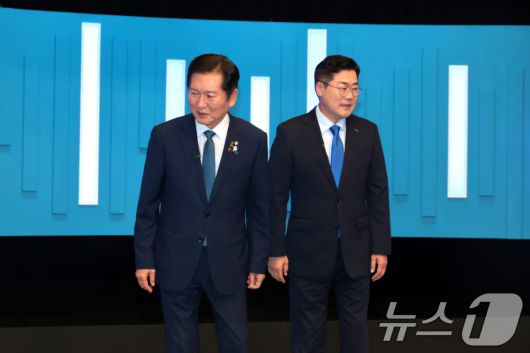 정청래(왼쪽), 박찬대 더불어민주당 당대표 후보가 16일 서울 양천구 목동 SBS에서 TV토론회에 앞서 기념촬영을 마친 뒤 자리로 향하고 있다. 2025.7.16/뉴스1 ⓒ News1 국회사진기자단 |