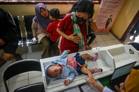 지난 2월 인도네시아 수라바야에서 열린 전국 무료 건강검진(PKG) 프로그램 개막일에 의료진이 지역 보건소에서 아기를 살펴보고 있다. (사진=AFP) |