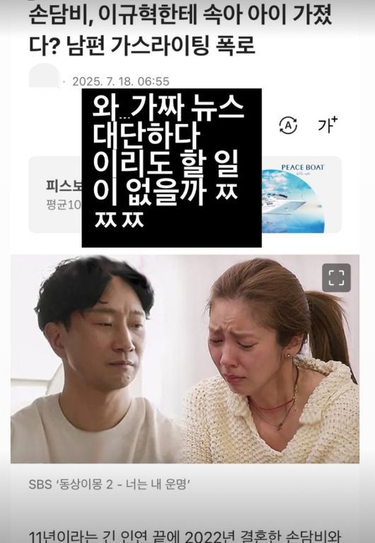 해당 게시물에는 손담비와 이규혁에 관한 뉴스가 캡쳐돼 있었다. 해당 뉴스의 제목은 ‘손담비, 이규혁한테 속아 아이 가졌다? 남편 가스라이팅 폭로’로, 손담비는 사실이 아닌 자극적인 제목의 뉴스에 불쾌감을 드러낸 것이었다.